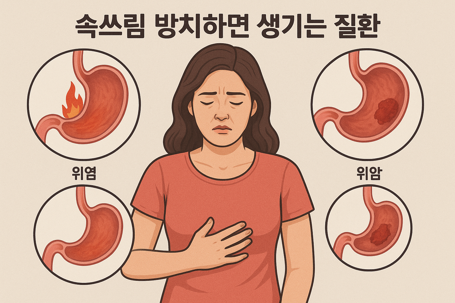 속쓰림은 현대인에게 매우 흔한 증상이지만, 이를 단순히 ‘소화가 잘 안 되는 불편감’ 정도로 치부하고 넘어가는 경우가 많습니다. 하지만 의학적으로 속쓰림은 위장관 건강에 적신호가 켜졌음을 알리는 중요한 신호이며, 방치했을 경우 위염, 역류성식도염, 위암 등 심각한 질환으로 이어질 수 있습니다. 특히 한국인의 식습관과 생활 패턴은 이러한 질환의 발생률을 높이는 환경을 제공하기 때문에 각별한 주의가 필요합니다. 속쓰림을 방치했을 때 발생하는 대표 질환과 구체적인 관리 방법까지 다루어 보겠습니다.