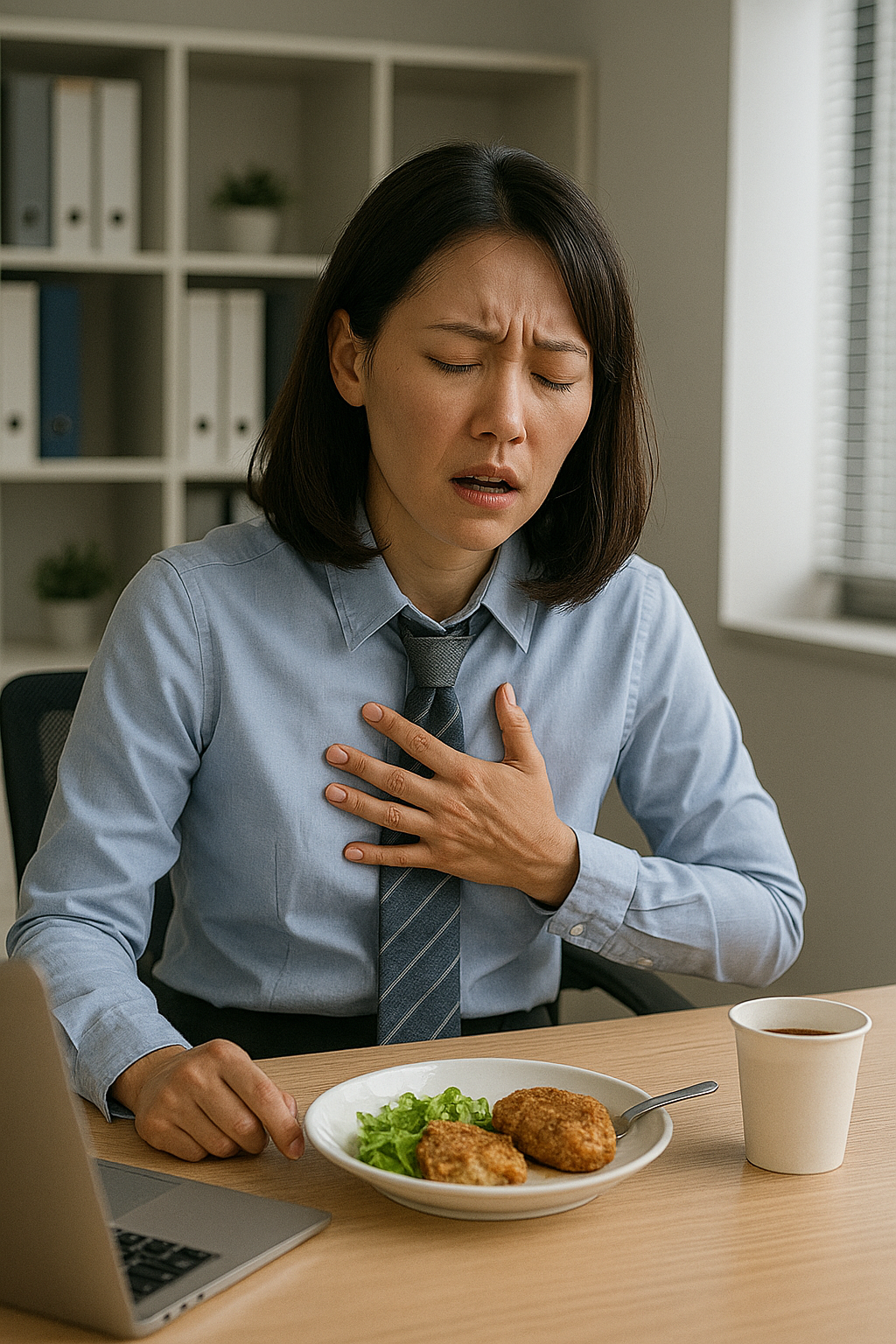 야근 후 늦은 시간 식사하고 곧바로 눕는 습관은 위산이 식도로 역류하는 원인이 됩니다. 역류성 식도염은 만성적인 목 이물감, 가슴 쓰림, 기침 등 다양한 증상을 유발하며, 치료하지 않으면 만성 질환으로 진행될 수 있습니다.